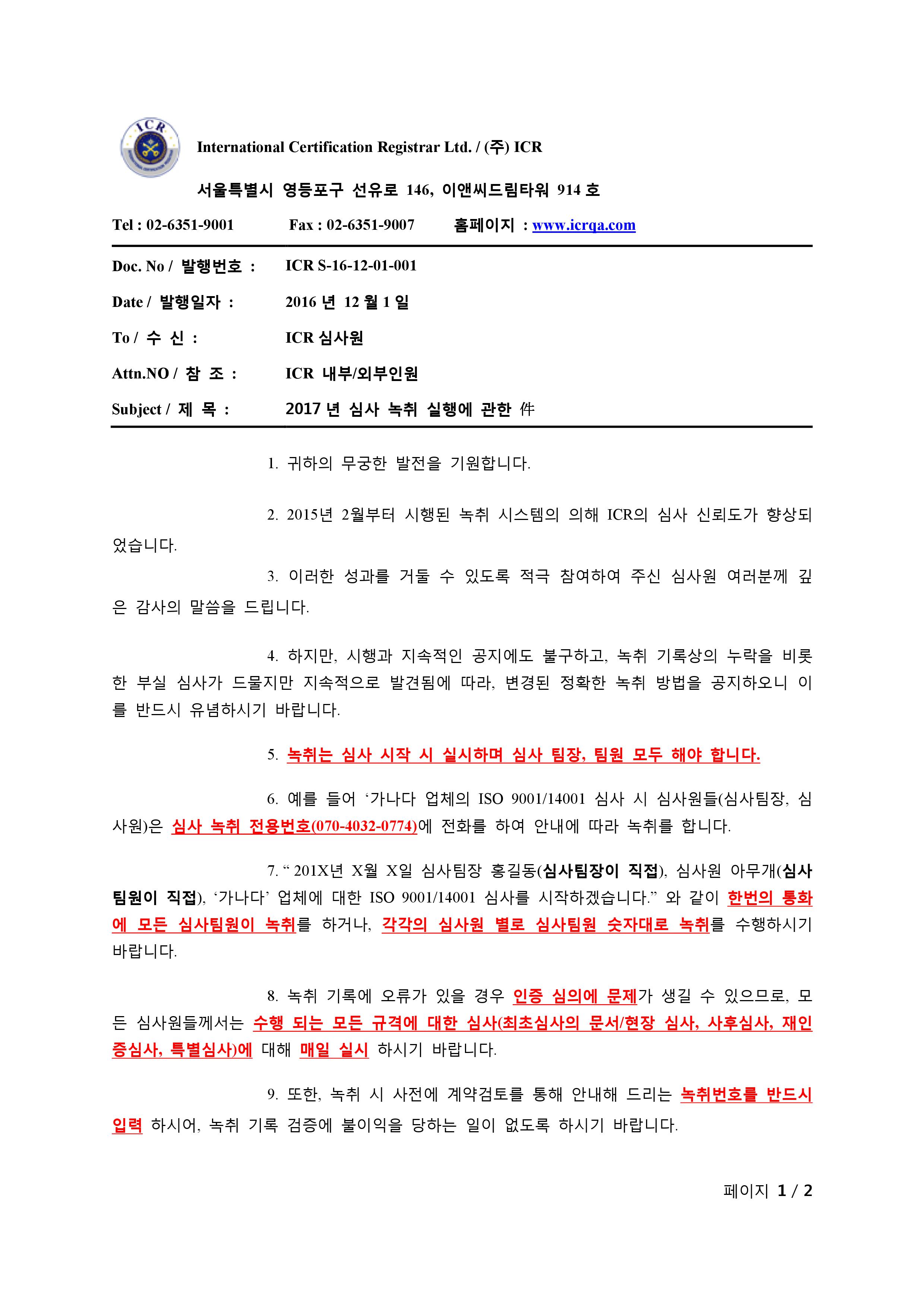2017년 녹취 지침 변경에 관한 건