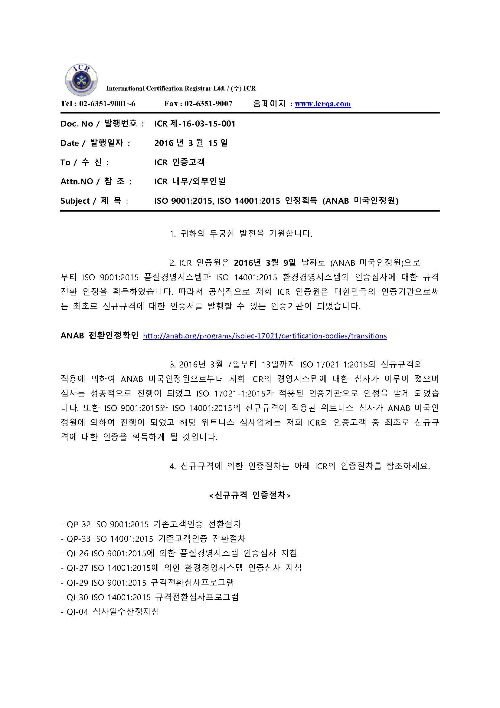 ISO 9001:2015, ISO 14001:2015 인정획득 (ANAB 미국인정원)
